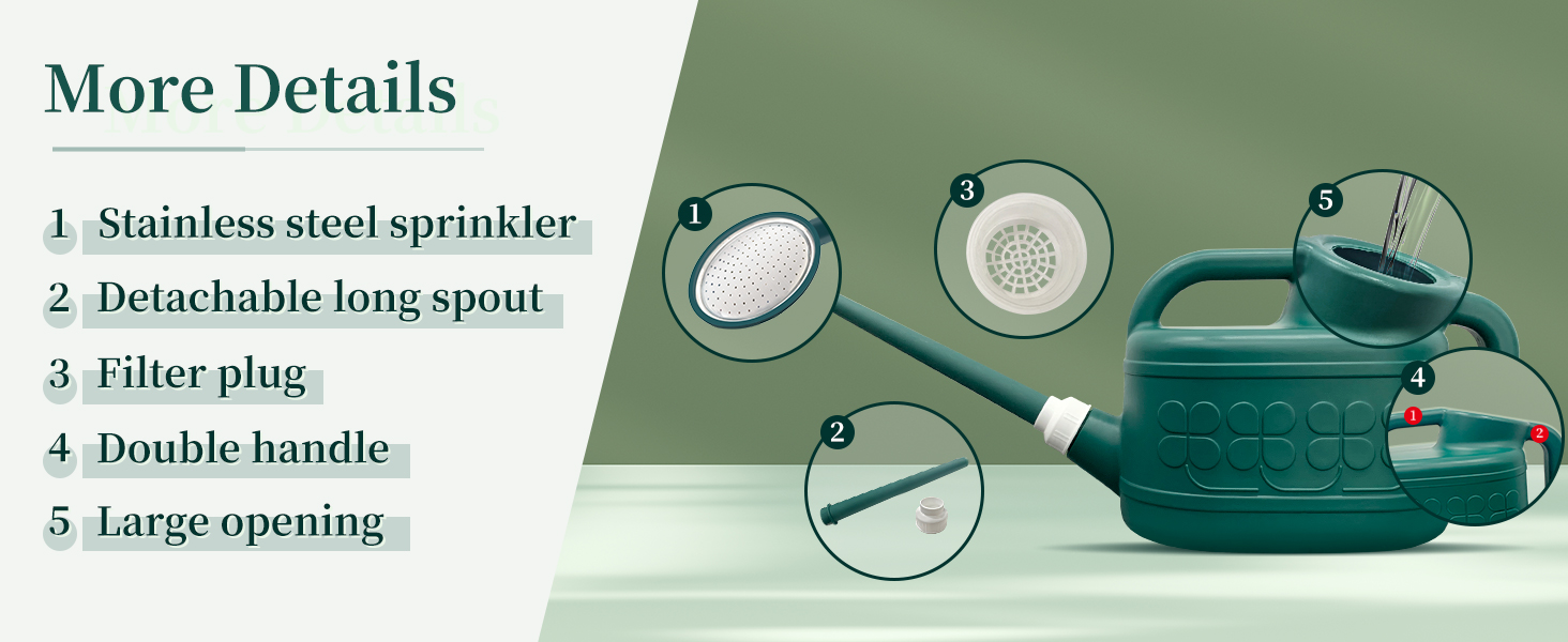 - [QUALITY COMES FROM DETAILS, DETAILS LIE IN THE HEART]-Starting with every detail you can see, watering can for outdoor plants with wide opening on the top, you can inject water quickly and easily clean stain. The reasonable ergonomic double handle design makes the grip extremely comfortable, when watering can is filled with water, the top handle helps to lift and pour better. The watering can also has a filter plug that filters out impurities in the water without clogging the shower head.