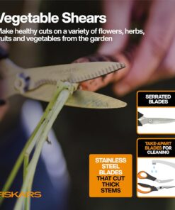 - Vegetable Shears have stainless steel blades with a serrated edge that holds thick stems for clean cuts