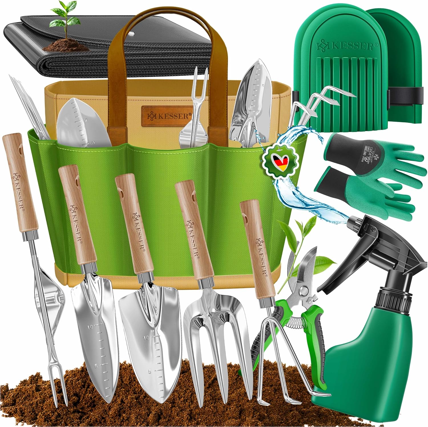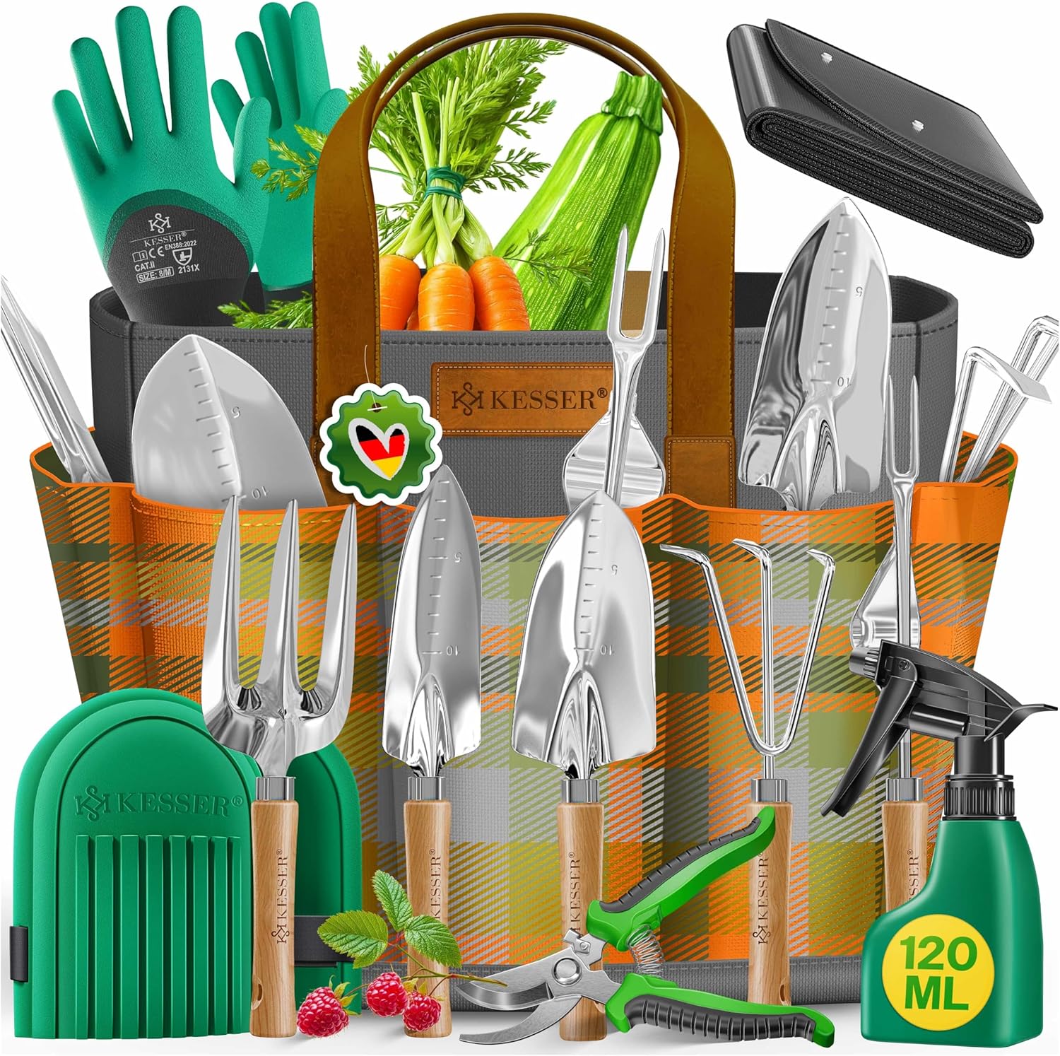 - Complete set: the 10-piece KESSER garden tool set contains everything you need for successful gardening. In addition to the five gardening tools, knee pads, plant mat, pruners, spray bottle and gloves are also included. The practical bag offers plenty of space for all the tools and keeps them close at hand and organised – a comprehensive set for all garden lovers.