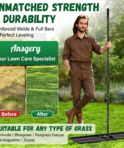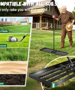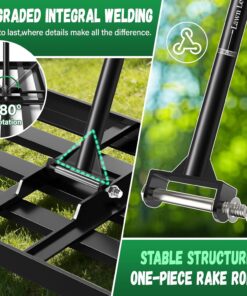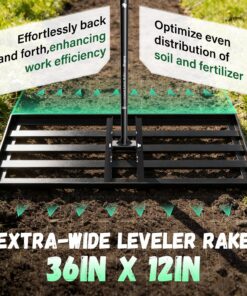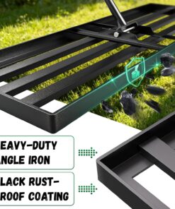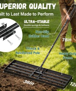 - Wide Range of Uses:This yard leveler is designed with a 36″ X 12″ wider rake head with smooth edges that won’t get caught up in dragging your lawn,making your job easier and faster.Flexibility to level lawns,farms, gardens,golf courses, and any type of surface such as Bermuda, Kentucky Bluegrass,Ryegrass,St.Augustine,and Fescue.Yard leveler also features a 180° swivel for even topsoil spreading and lawn levelling.It is recommended to mow your lawn to 1.5 inches or less to ensure the best results